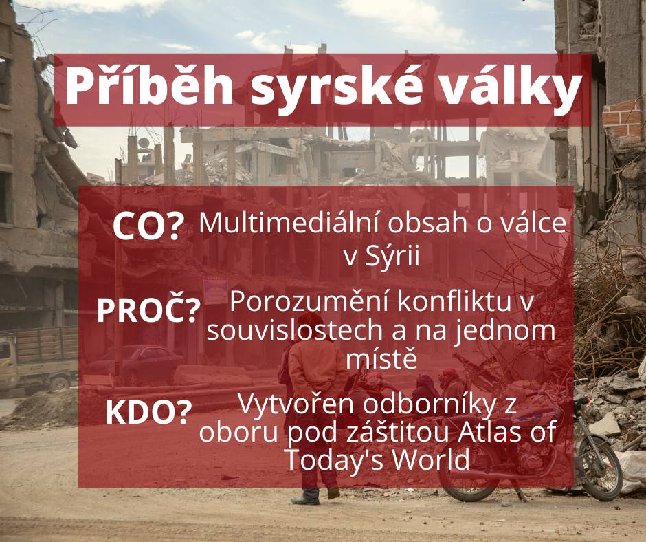 Dnes, v souvislosti s nedávným Světovým dnem uprchlíků, spouštíme pod záštitou organizace Atlas of Today's World alfa verzi našeho dlouho očekávaného speciálu o válce v Sýrii PŘÍBĚH SYRSKÉ VÁLKY ve kterém jsme spojili síly s dalšími humanitárními organizacemi a s aliancí českých akademiků, s cílem vytvořit dostupný a zároveň informačně kvalitní a objektivní obsah o válce v Sýrii, který umožňuje na jednom místě porozumět konfliktu jasně a v souvislostech. Navštivte alfa verzi webu zde https://warinsyria.org/. Web se bude ještě postupně vyvíjet (nezapomeňte jej proto navštívit i v budoucnu).