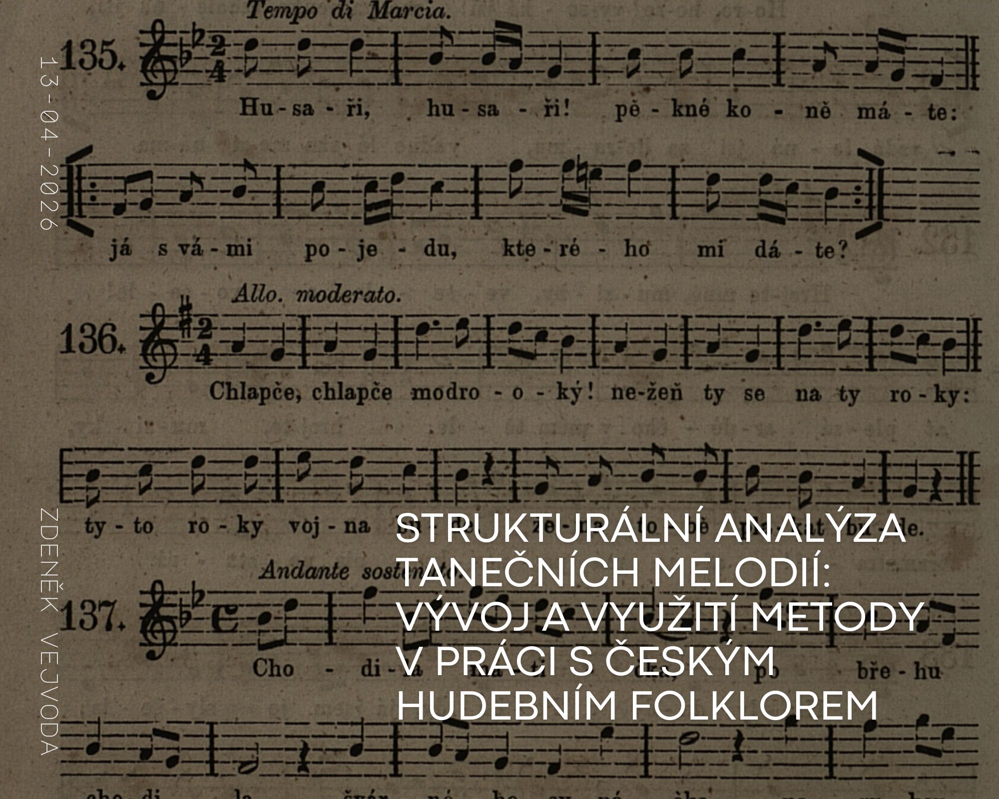 Hudebně-analytická práce má v oboru české lidové hudby tradici od počátku 20. století (O. Hostinský, O. Zich). Již od té doby byli pracovníci našich akademických institucí v těsném kontaktu s vývojem této subdisciplíny hudební folkloristiky či etnomuzikologie ve světě. V Praze tento směr v 90. letech významně rozpracoval L. Tyllner, na jehož koncepci v oddělení etnomuzikologie a etnochoreologie Etnologického ústavu AV ČR v posledním čtvrtstoletí navázala metoda (již digitálněvýpočetní) strukturální analýzy. Výsledkem dlouholetého výzkumu v této oblasti je syntetická práce o české lidové písni (L. Tyllner – Z. Vejvoda 2019), stojí však také v pozadí odborného portálu, jehož jádrem je transmediální databáze české lidové hudby (M. Kratochvíl – P. Nuska – Z. Vejvoda 2025). Ta má rovněž úspěšnou popularizační, veřejně přístupnou platformu www.pisnovna.cz. Přednáška Z. Vejvody ozřejmí teoretický základ a využití metody strukturální hudební analýzy ve výzkumu, ediční praxi a transferových aktivitách, např. v pedagogické aplikaci, a představí aktuální plány v tomto oboru do budoucna.